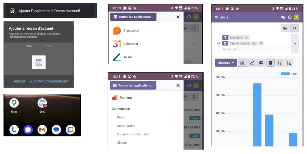 Encore mieux : vous pouvez ajouter un raccourci sur l’écran d’accueil de votre téléphone et transformer Odoo en véritable application mobile (web app) avec le menu « Ajouter à l’écran d’accueil » 🚀